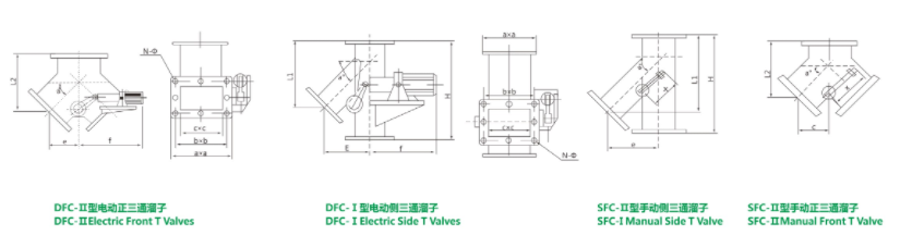 本阀主要由阀体、阀轴、阀板、曲柄机构、推杆(电液动推杆、气动推杆或手动机构)等组成。工作时,电、液动推杆的直线往复运动,(手动由外力)通过曲柄带动阀轴、阀板作一定角度的摆动,从而达到控制物料流向,分送物料送物料之目的。
