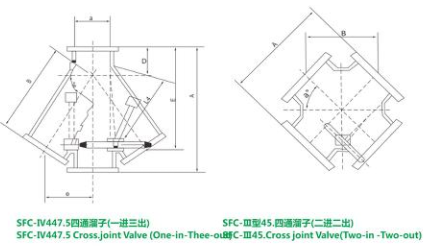 DFC电动(手动、电液动与气动)三通分料阀为Ⅰ、Ⅱ型,均带导向板,Ⅰ型为侧三通分料阀,Ⅱ型为正三通分料阀,四通分料阀分为ⅢⅣ型,均带导向板,Ⅲ型为二进二出,Ⅳ型为一进三出。